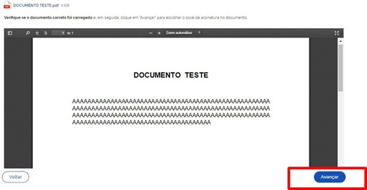 Na próxima página revisar o documento e clicar em “Avançar”.