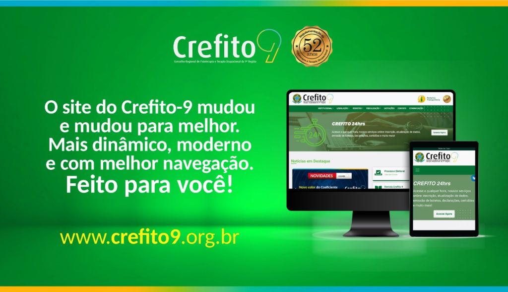 O site institucional do Conselho Regional de Fisioterapia e Terapia Ocupacional da 9ª Região (Crefito-9) foi totalmente reformulado e já está no ar. O intuito da mudança é facilitar ainda mais o acesso aos serviços e informações do Conselho.